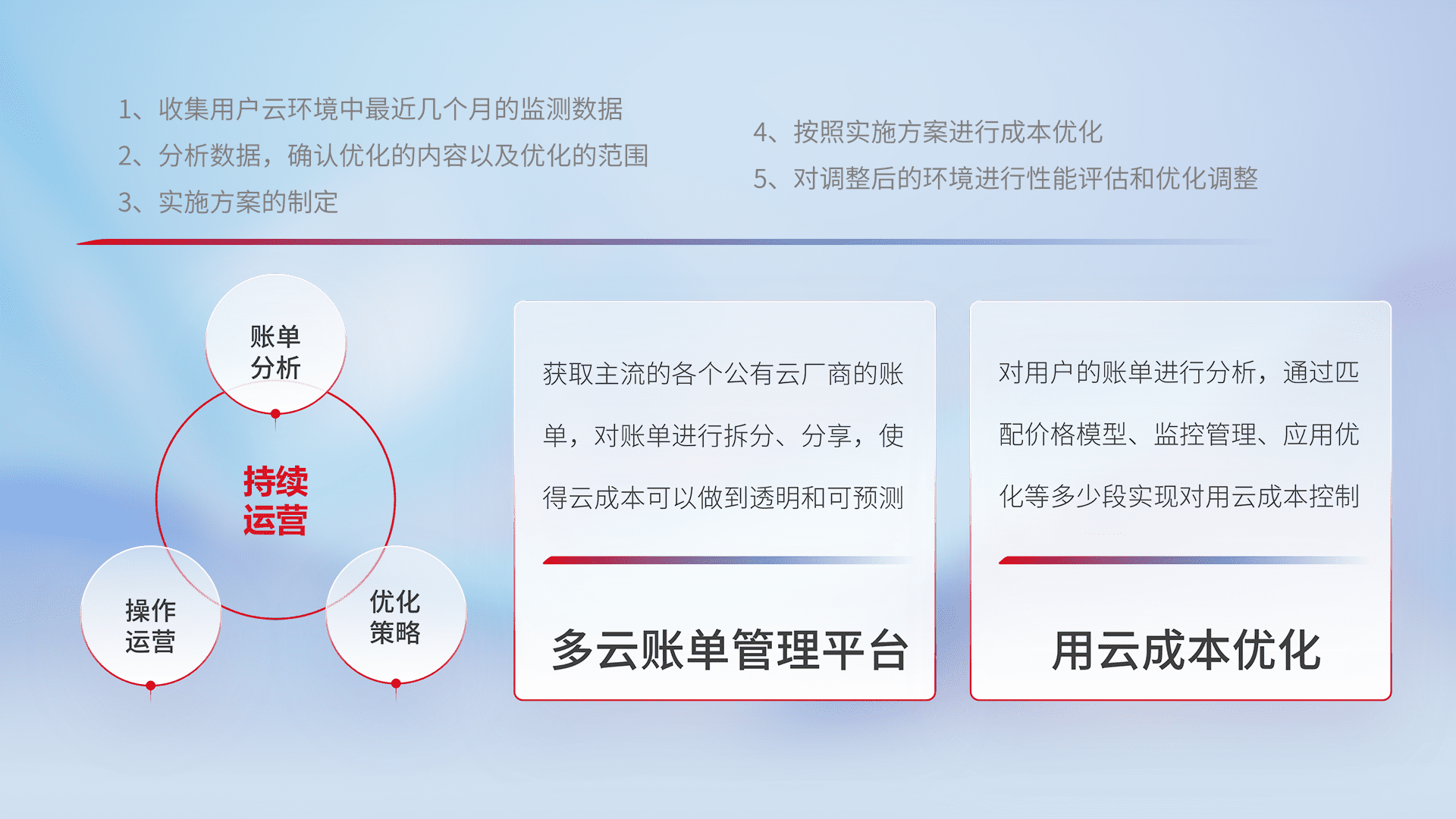 通过多云纳管,,以统一的资源数据模型把客户的云资源进行抽象和封装,,,进而实现对多云资源的统一操作,,保障云资源管理的可靠性、、、、稳定性与可用性。。量身定制化运维内容,,配置、、、开发运维、、补丁管理、、、备份、、监控、、认证和访问管理、、、、审计和日常巡检等,,保障在用云过程中的可靠度,,稳定度以及高可用率。。